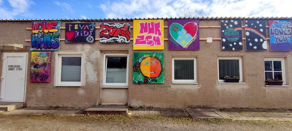 Sechzehn Schüler*innen von der 3. bis zur 12. Klasse haben gemeinsam mit Graffitikünstler Ralf Hecht zum Schulgeburtstag ein sichtbares Zeichen für Vielfalt, Toleranz und demokratisches Miteinander geschaffen. Entstanden ist ein dauerhaftes Graffiti-Ensemble an der Außenfassade des Schulclubs und der Schulsozialarbeit – ein Symbol für Partizipation und kreative Zusammenarbeit.