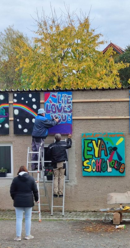 Ende September wurden die gestalteten Holzplatten vom Team Technik des Schulzentrums an der Außenfassade des Schulclubs und der Schulsozialarbeit angebracht. Unterstützt wurden sie dabei von engagierten Eltern im Rahmen eines Arbeitseinsatzes. So entstand ein dauerhaft sichtbares Symbol für Vielfalt, Partizipation und demokratisches Miteinander im Schulalltag.